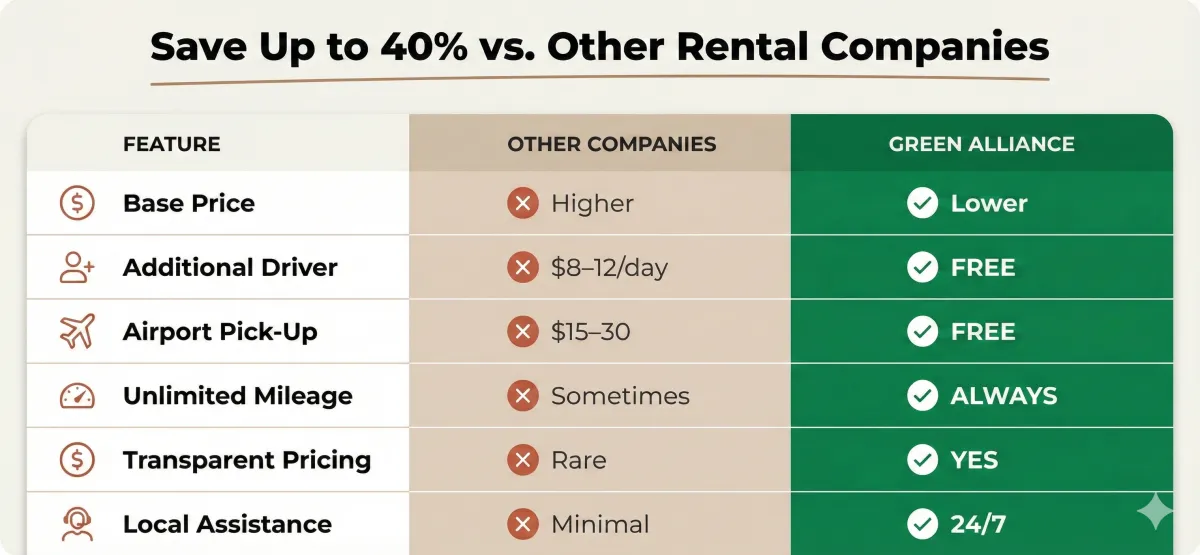 Most companies hide fees until you arrive at the counter. We do the opposite.
